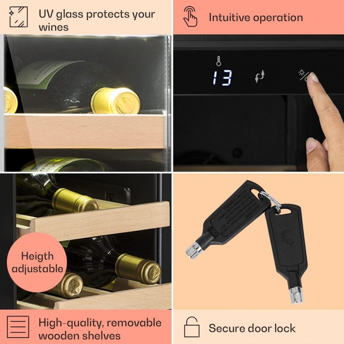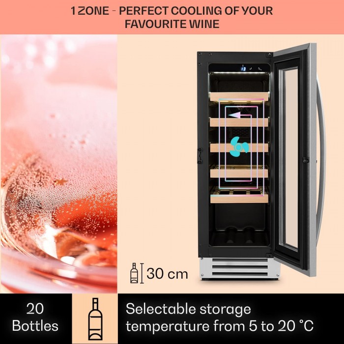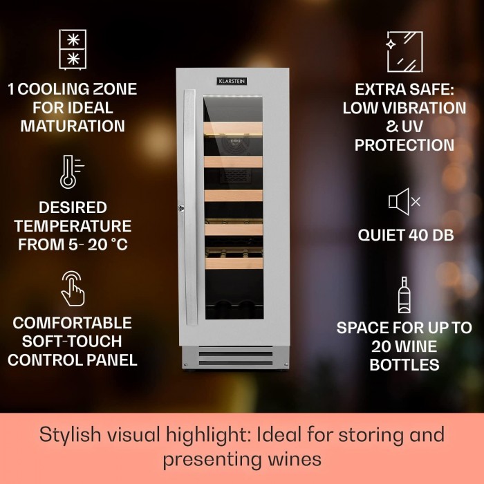 Zinātājiem un dizaina cienītājiem: Klarstein iebūvētais Vinovilla 20 piedāvā stilīgu vīna, dzirkstošā vīna un šampanieša uzglabāšanas vietu. Raksturlielumi