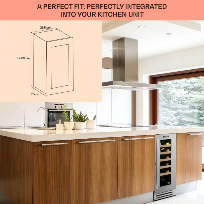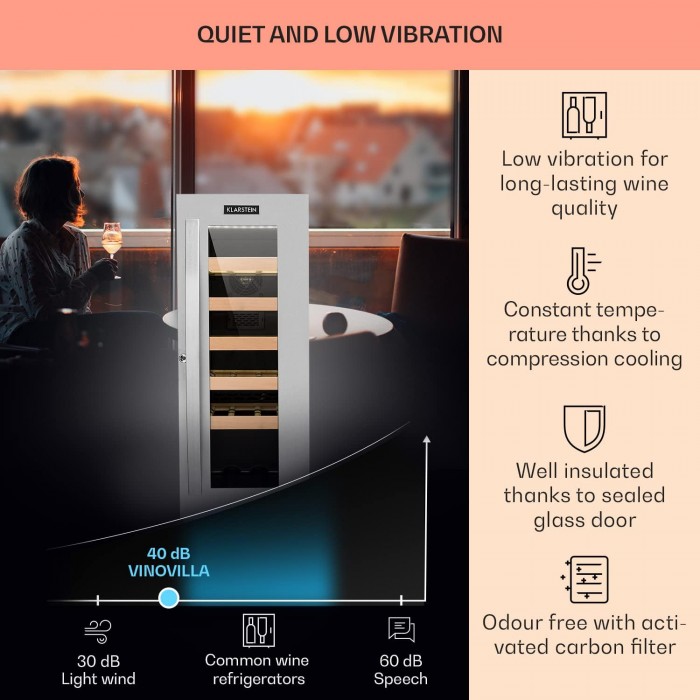 Elegants dizains un zems enerģijas patēriņš: Klarstein Vinovilla 20 vīna ledusskapis ir mazs, praktisks ledusskapis, kas papildinās jebkuru dzīvojamo zonu un virtuvi, pateicoties tā modernajām stikla durvīm ar nerūsējošā tērauda priekšējo paneli. Laipni lūdzam profesionālajā vīna uzglabāšanas līgā! Iebūvētais vīna ledusskapis nodrošina ilgstošu uzglabāšanu bez smaržas, pateicoties aktīvās ogles filtram, nodrošinot smalko vīnu saglabāšanu optimālā dzeršanas temperatūrā.