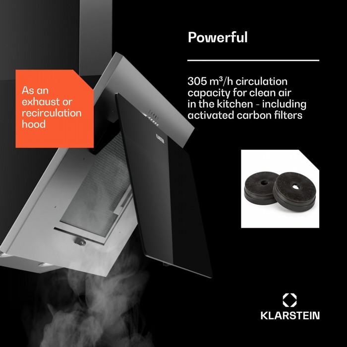 Papildus augstajām veiktspējas īpašībām Alessia pie sienas stiprināmais tvaika nosūcējs pārsteidz kā luksusa virtuves iekārta: melnā spīdīgā drošības stikla priekšpuse piešķir tai greznu izskatu, ko papildina nerūsējošā tērauda skursteņa pārsegs.