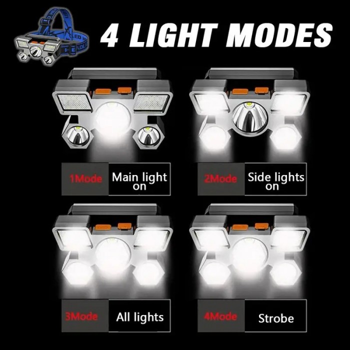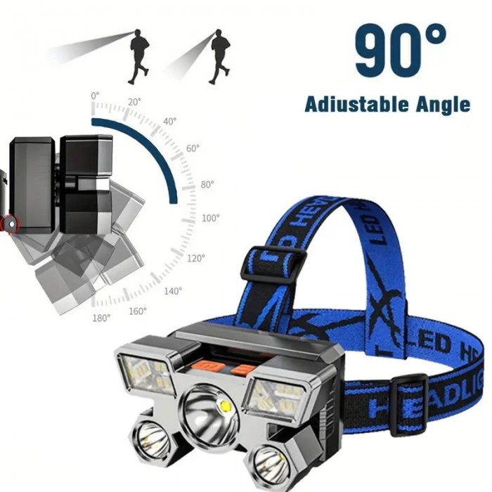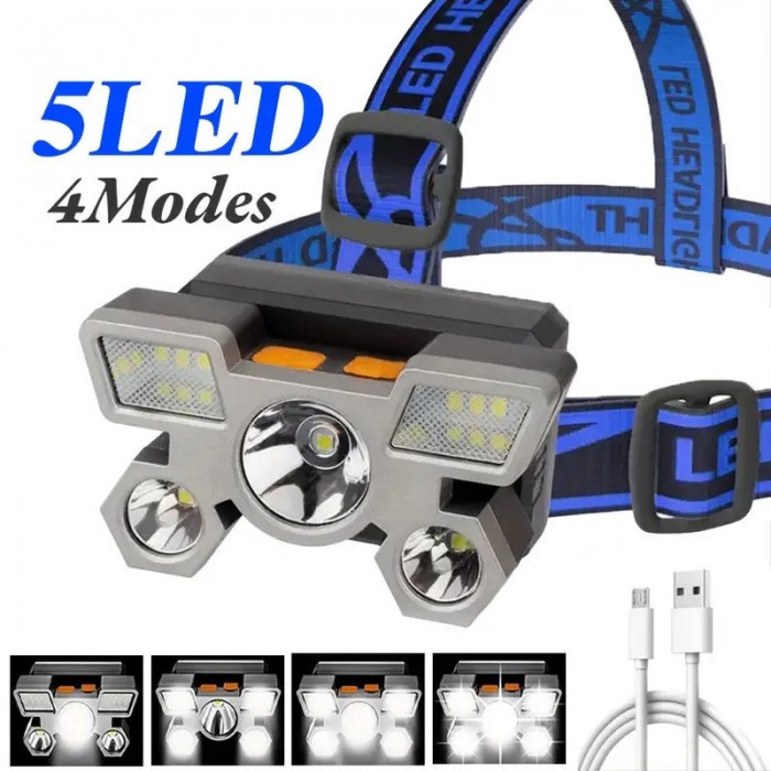 Spilgti 5 LED priekšējie lukturi, USB uzlādējama, regulējama zila siksna — ideāli piemērota nakts makšķerēšanai, skriešanai, piedzīvojumiem un ārkārtas darbam, piedzīvojumu aprīkojums | Regulējams priekšējais lukturis. Izturīga konstrukcija, uzlādējams priekšējais lukturis.
