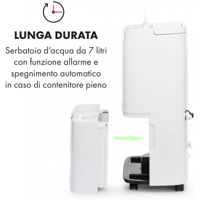 AUTOMĀTISKĀ FUNKCIJA: 7 litru rezervuārs savāc ūdeni un, pateicoties trauksmes funkcijai un automātiskai izslēgšanai pilnas rezervuāra gadījumā, tas tiek iztukšots īstajā laikā. Iztukšojiet ūdeni no šļūtenes, nospiežot tās pogu